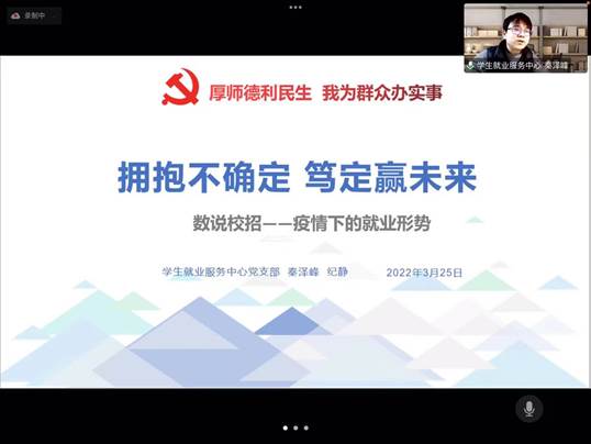 秦泽峰老师从宏观层面分析了当前就业大环境,并根据疫情下的就业政策以及就业形势之变,结合公司特点和公司马克思主义理论专业毕业生特点,就今年就业形势、就业情况、就业薪资水平等,深入实际为公司毕业生提供了就业建议,希望同学们打破舒适区,先就业再择业。