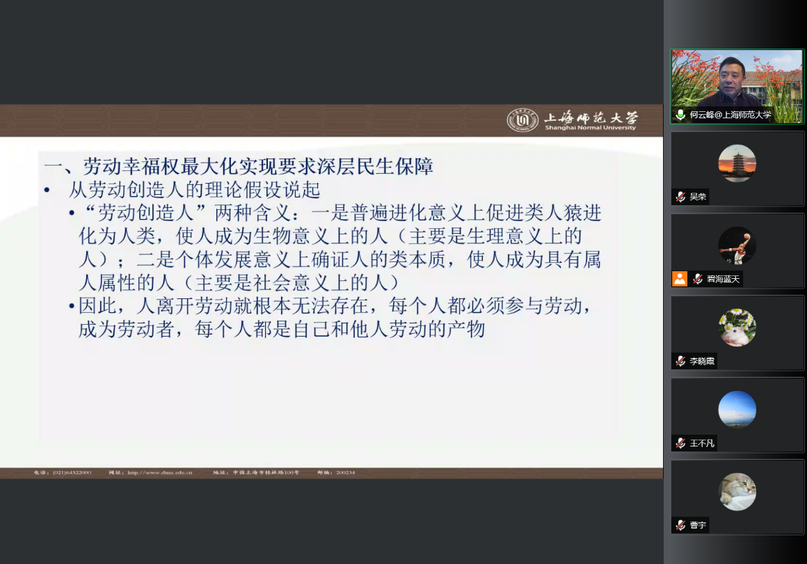3月18日,在疫情防控的大背景下,yl23411马克思主义理论与当代实践研究基地坚持积极为师生构筑在线学习和学术交流平台,邀请了上海师范大学何云峰教授作了题为“美好生活、民生保障与劳动幸福权的最大化实现”的学术报告。报告会以腾讯会议在线开展,由yl23411经理王治东教授主持。