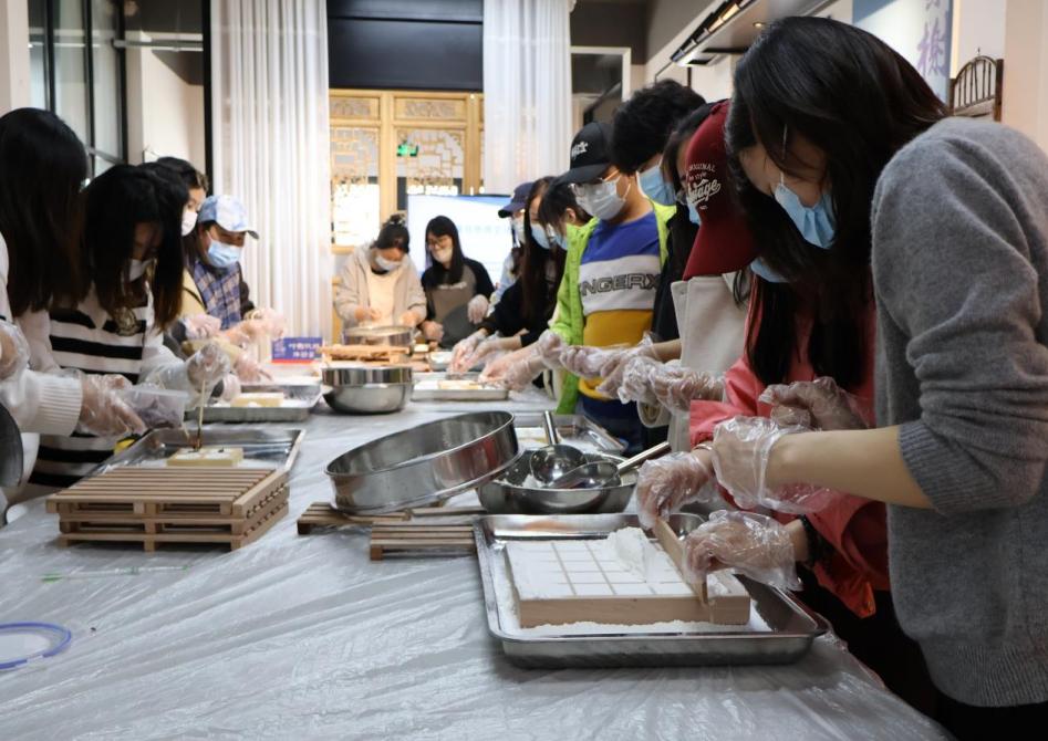 (支部成员在乡村振兴展示馆研讨交流) 在调研过程中,一项特别的活动引起了大家的兴趣——制作叶榭米糕。叶榭米糕作为当地的一项非物质文化遗产,以其独特的制作工艺和口感深受人们喜爱。在叶榭镇文化传承人的指导下,同学们亲自动手,体验了非遗文化米糕制作的全过程。