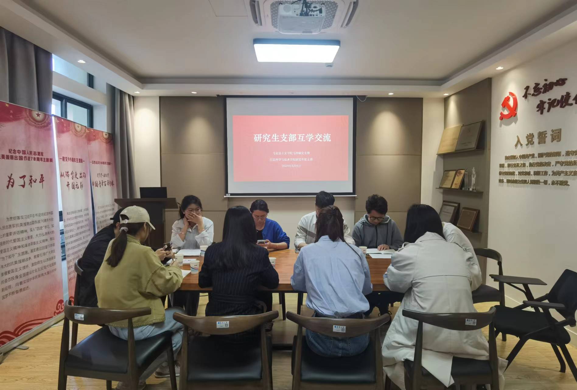 二、校内联学,推动党纪学习教育互学互鉴支部积极参加校内联学活动,同校内兄弟支部互学互鉴,共同学习党章党纪,交流党纪学习教育活动的组织经验。支部同信息公司研究生党支部开展联学交流活动,围绕学习《中国共产党纪律处分条例》心得体会进行充分交流。支受邀参加了机械公司众创空间党支部举行的“学纪明规 正身立行 爱国奉献 请党放心”党纪学习教育主题党日活动,开展学习交流。