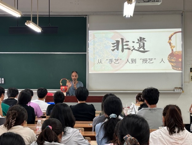 (国家级非遗泥金彩漆传承人陈龙老师在课堂与员工互动) 国家级非遗泥金彩漆传承人陈龙老师,携带着他亲手制作的作品登场。陈老师在课堂展示了多件获奖泥金彩漆作品图片,这些非遗作品一下子就把同学们的兴趣提了起来,其精湛工艺令同学们赞叹不已,课堂被燃动起来。陈老师强调:“保护与传承非遗不仅是责任,更是对文化的尊重与延续。”他呼吁在座师生关注并参与非遗保护,共同为中华优秀传统文化的传承与发展贡献力量。